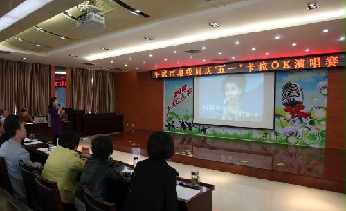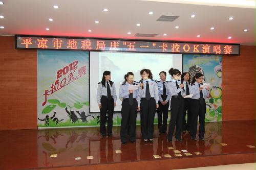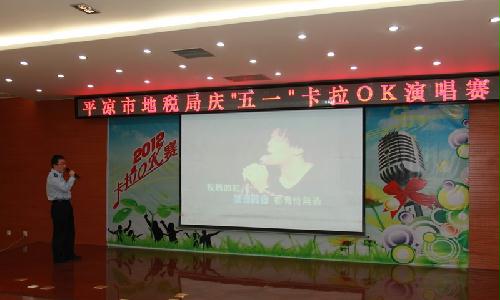 4月26日下午,平凉市地税局五楼多功能会议室欢声笑语、歌声飞扬,由市局工会主办的“庆五一”卡拉OK演唱赛在这里正式开唱。来自机关科(室)、分局共20余人参加了演唱,机关全体干部职工观看了演出。