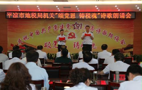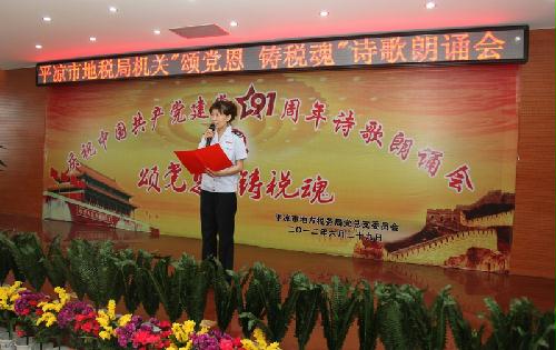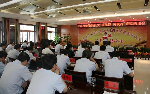 6月29日上午,878-365体育在线投注机关党总支组织开展了“颂党恩铸税魂”为主题的庆祝建党91周年诗歌朗诵会活动。市局机关三个党支部的全体党员、干部职工和离退休党员代表共约70人参加了这次朗诵会。