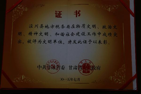 近年来,泾川县地方税务局在县委、县政府和市局的领导下,全县地税系统认真贯彻党的十八大、十八届三中、四中全会精神,以邓小平理论、“三个代表”重要思想、科学发展观为指导,紧紧围绕“依法组织税费收入是第一要务,努力加强思想理论建设,不断深化队伍建设,不断提高全系统干部职工的思想道德素质、科学文化素质;积极推进税务文化建设,在物质文明、政治文明、精神文明、和谐社会建设工作,取得了显著成效,得到了省委、省政府的肯定,荣获文明单位荣誉称号。