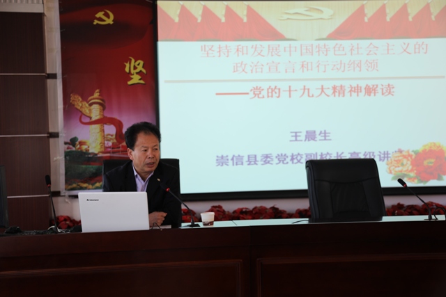报告会上,县委党校副校长、高级讲师王晨生同志从大会概况、十九大《报告》内容的学习重点、十九大新的历史方位、新的理论成果、新的历史使命等方面入手,对十九大精神进行了深入辅导和学习,报告紧扣党的十九大大会主题,紧扣习近平新时代中国特色社会主义这个主线,紧扣我国社会主要矛盾的发展变化,系统全面深入的对党的十九大提出的新思想、新战略、新要求作了重点突出的剖析和解读。